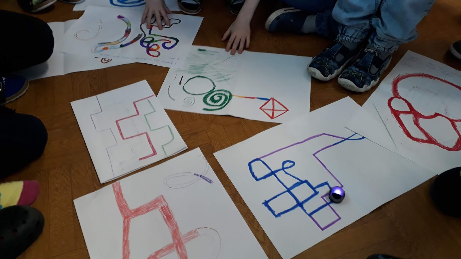 Druhá skupina se rozdělila do 3 menších skupinek a měla za úkol vyřešit problém - děti měly zjistit parametry čáry, po které je Ozobot schopný jet bez přerušení, otáčení, zmatkování atd. Během svého pokusování se měly zaměřit na prozkoumání barvy čáry - jestli ovlivní to, co Ozobot dělá - tloušťky čáry a její tvar - jestli to může být čára lomená, přímá, jestli se může křížit atd.